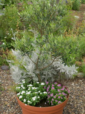 シロタエギクの寄せ植え(ニチニチソウ、オリーブなど)