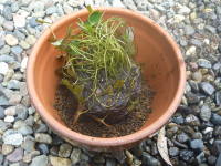 時期は4月頃に行うとよいです。根が横に伸びるので7号鉢以上の平鉢を使用するとよいです。植え替えの際は株が増えている事が多いので、一回りか二回り大きな鉢に植え替えますが、鉢を大きくしたくない場合は株分けして同じ大きさの鉢に植え替えればよいです。裸苗が直射日光に当たって乾いてくると萎えてくるので、直射日光に当たらないような所で、乾かさないようにしながら行います。| 耐寒性スイレンの植え替え(4月上旬) |
