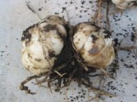 時期は葉が枯れる10月から11月頃、鉢植えの場合は毎年掘り上げて、必要なら分球して植え付けます。庭植えの場合は連作を嫌うので、3年に一度ぐらい、別の場所に植え直します。ユリの仲間の根は、地中に埋まった茎から伸びる上根と球根の下から伸びる下根があります。球根の下から伸びた下根は取り除かないようにして、上の茎は切り取ります。上の茎の上根に木子(子球)ができていれば、切って植え付けると数年で開花します。増やし方