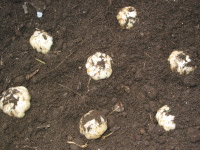 球根の鱗片の根本を3分の2ぐらい埋めると芽が伸びてきます。適温は20℃から25℃ぐらいで、時期は秋の10月頃、春の3月から4月頃に行うのがよいと思います。埋める側の切り口は日陰で乾かしてから行います。秋に行った場合は冬になったら室内の明るい場所で育てます。芽が伸びて霜の心配がない時期に鉢上げします。![]() スカシユリの鱗片 |