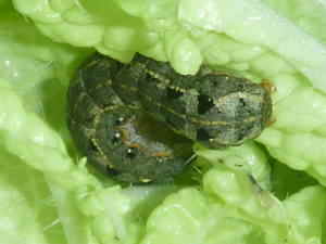 ハスモンヨトウなど沢山の種類がいて、夜になると活動して葉を食害します。春と秋に被害がある事が多く、ふ化した頃は緑色で体長5oぐらいと小さく、葉の裏を薄くかじって透けたようになります。2cmぐらいに大きくなると茶色っぽくなり、葉が沢山食べられるようになります。小さい頃は葉裏などに隠れていますが、大きくなると昼間は土の中に潜っています。見つけにくいので株元にオルトラン粒剤をまいたり、小さいものは葉裏にいる事があるので、補殺したりベニカXファインスプレーやベニカS乳剤などを散布しておきます。