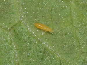 大きさは1.2mm前後で春から秋に発生して、葉の汁を吸われて生育が悪くなります。200種類ぐらいいると言われ、成虫、幼虫ともに害があります。ハダニに吸われたのと区別し難く、アザミウマの幼虫は黒い糞が残っているので見分けられます。見つけたらベニカXファインスプレー、ベニカ水溶剤など対応した殺虫剤を散布します。また株元にオルトラン粒剤をまくと防除できます。