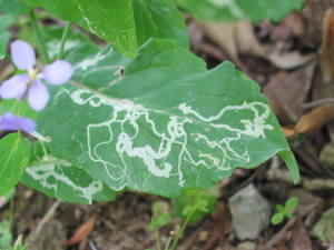 春から秋に発生します。葉の中に卵を産みふ化すると中を這って食害するので、クネクネと曲がった白い模様が出来ます。葉の見かけが悪くなり酷くなると葉が枯れる事があります。幼虫には殺虫剤が効かないので、先端を圧迫して駆除したり葉の部分を取り除くようにします。