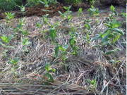 夏は雨がたまに降ってくれれば与える必要はありませんが、日照りが続く場合は数センチ土を掘って湿り気がないようなら与えます。乾燥に強いコスモスなどはほとんど水やりは不要ですが、水を好む植物は乾き過ぎると萎えてくるので、あまり乾燥させないように注意します。夏の水やりは昼間に与えると蒸れて根が腐る事があるので、朝や夕方の涼しい時間帯に与えるようにします。昼間に萎えてしまった場合は、水を与えて元気になるまで日よけしてあげるとよいです。夏に日照り続きで雨が降らない時は、乾燥を防ぐために藁やマルチング材、マルチングチップなどを敷いて、乾燥を防ぐように工夫するとよいです。![]() 土の渇きが早いのでカヤを敷いた |