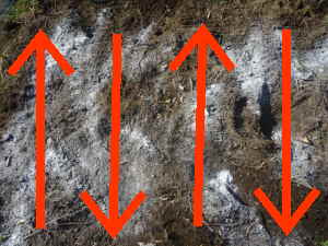 土が固くなってしまうと排水性と通気性が悪くなってしまうので、耕して土に空気が含まるよう柔らかくします。石灰や堆肥を混ぜる時に行いますが、一緒に混ぜると根に悪い影響のあるガスが発生する事があるので、別々の日に行うのが推薦されています。植え付けや種まきの2週間前に石灰をまいて耕し、1週間期間をあけてから堆肥を混ぜ込みます。使う道具は桑やスコップがよく使われ、表層の土と30cmぐらい下の土を反転させるように耕します。はじめは土が固くて桑が入り難い場合はスコップで行うと楽になります。植えつけ1週間前の堆肥を混ぜる時には固まった土を桑を使って細かく砕きます。耕す方向はスコップの場合は後方に、桑の場合はどちらでもよいですが、自分は耕した土を踏み固めないよう後方に進む事が多いです。植え付け前には必要なら緩効性の化成肥料をまいて混ぜ込み、桑やレーキを使って平になるように土を慣らせます![]() 耕す方向 |