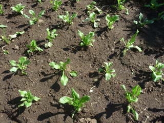 日当たりのよい所に、酸性土壌を嫌うので苦土石灰、水はけが悪いようなら腐葉土を、元肥に化成肥料と堆肥を混ぜ込んで植え付けます。間隔は15cmから20cmぐらいを目安にすればよいです。寒さには強く暖地では多少の霜や雪が被っても大丈夫です。![]() 庭への植え付け |