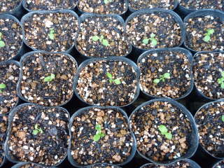 時期は8月中旬から9月頃に行えます。発芽する適温が20度ぐらいなので、涼しくなった9月になってまいた方が容易です。8月中旬頃に種をまくと開花は早く12月には花が見られ、9月下旬にまくと翌年の早春頃からの開花になります。8月中旬といえばまだ気温が高いので、涼しい場所で行うように気をつけます。また好光性で種が深く埋まると発芽し難くなるので、覆土しないか薄くする程度にする事に気をつければ容易に発芽します。簡単な方法は平鉢にばらまいて、水やりは鉢底の受け皿に水を貯めて行うと容易です。またピートバンというのが売られているので、それを利用しても楽に行えます。発芽率はよいので箱まきでも勢いよく水を与えて種が埋まらないように注意すれば、沢山の苗を作って花壇に植える事もできます。本葉が2、3枚になったらポットに仮植えして、根が回ってきたら庭や鉢に定植します。やや乾燥を嫌うので、土を乾かしすぎないように注意してください。| 9月中旬 |