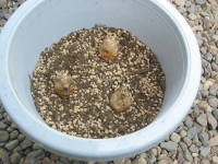 高温を必要とするので、植えつける時期は4月から5月頃に植えつけるとよいと思います。用土は花の培養土や自分で作る場合は赤玉土(小粒)6、腐葉土4などに植えつけるとよいです。鉢植えでは7号鉢に3球を目安に深さ5cmぐらいに植えつけます。肥料を好むので、植え付けの際はマグァンプK(中粒)などの元肥を混ぜ込んで植えつけるとよいです。球根の生育には高温を必要とするので、プラ鉢に植えつけるとよいと思います。![]() 球根の植え付け |