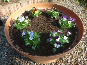 6号鉢では大球で3個、普通の大きさで4個ぐらい、プランター植えでは5cmから10cmぐらいのスペースをあけるとよいです。土は市販されている花の培養土でよいです。自分で作る場合は赤玉土6、腐葉土3、パーライト1など、自分好みの水はけのよい土を利用すればよいです。覆土は球根の頭が隠れるぐらい被せます。元肥は球根下の土に緩効性の化成肥料を混ぜたり、置き肥をしてもよいです。写真は大型のコンテナにビオラを鉢の周りに、チューリップの球根を中央に3つ植えたものです。| 鉢の中央に植え付け(11月中旬) |