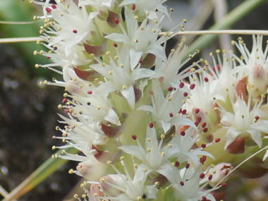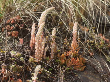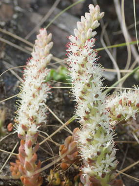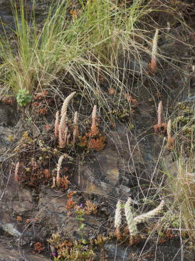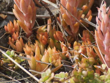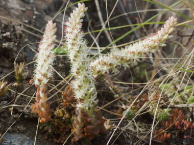 ツメレンゲは日本の長野県から九州の乾燥した岩場などに生えている多肉植物です。クロツバメシジミという小さな蝶の幼虫が好んで食べ、卵が産み付けられる事でも知られています。写真は海沿いの岸壁に咲いていましたが、特に海沿いに限らず、乾燥した岩場の山間部、長野県では河原の堤防、石垣、屋根にも生えているそうです。名前の由来は葉が爪のように尖っていて、蓮華座のように見えるのでこのような名前になったそうです。春から秋は緑色の葉をしているのですが、秋にると葉が赤く紅葉して、長い花穂を伸ばし花を咲かせます。最近は数が減って準絶滅危惧に指定されているそうです。多肉植物の中では比較的育てやすい方です。
