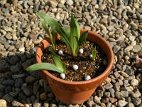 時期は9月中旬から10月頃に行います。鉢に植える場合、背が高いタイプは6号鉢に5球を目安に、背が低いタイプは5号鉢に5球を目安に深さ5cmぐらいに植え付けます。鉢植えの用土は水はけのよい花の培養土や自分で作る場合は赤玉土6、腐葉土4などに、あればパーライトを1割ぐらい混ぜて植え付けます。庭植えの場合は苦土石灰、腐葉土、牛糞などを混ぜて、植付け間隔は背が高いタイプは10cm〜20cmぐらいの間隔に、背が低いタイプは5cm〜10cmぐらいの間隔に深さ5cmぐらいに植え付けます。暖地では庭植えで問題ありませんが、寒い地域では鉢植えにして防寒が必要になるようです。![]() 2月上旬 |