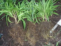 株分けで増やす事ができます。時期は植え替えと一緒に行います。ハサミや包丁などを使って切り分けます。 下は矮性の種類を秋に行ったものですが、春に行った方がよいと思います。秋の植え替え後は霜の当たらない軒下に置いておいた方がよいです。![]() 株分け前 |