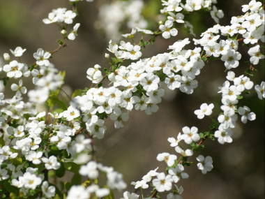 ユキヤナギは春の3月頃から花を咲かせる落葉性の樹木です。柳のような枝に0.5cmぐらいの小さな花を沢山つけ、その姿が雪が被っているように見える事からこのような名前になったようです。樹高は1.5mぐらいとあまり高くならない樹木で、通路などに植えられているのをよく見かけます。中国原産ですが、日本では関東、四国、九州の太平洋側にも生息しています。在来種の他に、早生種や晩生種など、白以外にも薄桃色の花を咲かせる種類もあります。他に近縁種で4月の終わり頃から八重咲きの花を咲かせるシジミバナというのもあります。