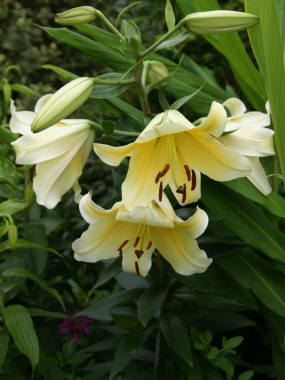 オーレリアンハイブリッドとも呼ばれ、中国原産のリーガルリリー、キガノコユリなどの交配種で、病気に強く庭に何年か植えっぱなしでも育ちます。筒状に花を咲かせるのが特徴です。その他