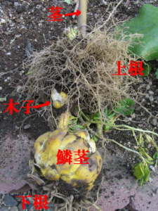 鱗茎という鱗片が集まったものが球根になっています。地上部の茎から鱗茎までの間に上根が出来て、それが主な養分の吸収源になるので、深めに植え付けるのが基本になります。![]() 球根の状態 |