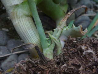 親株から子株が発生するので、それを分けて増やす事ができます。分ける子株は葉が5枚以上あった方が自分で生育する力が強いので、小さいものは無理に分けずに親につけたまま大きくした方が良いです。時期は植え替えと一緒に行います。![]() まだ小さい子株 |
