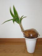 ココヤシは30mほどになる高木です。大きくしたい場合は、生育期の春から秋は肥料を与えて、日光によく当てて育てた方がよく育ちますが、あまり大きくしたくない場合は、午前中の日光に当てるぐらいにして、肥料切れさせない程度に、肥料を控えめにすればよいと思います。肥料切れすると葉色が悪くなるので注意してください。![]() 2006/5 |