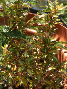 コプロスマは矮性の種類、木立性の種類があります。葉の色が緑色、白斑、赤っぽい斑入りなど光沢のある美しい葉をしています。上の写真はコプロスマ・レペンスという種類で、春から秋は葉の色が黄色と緑の斑入りに、赤っぽい縁の色をしていますが、冬になり寒さに当たると葉の全体が紅葉のように赤っぽく変化します。耐寒温度が−5どぐらいあるので、暖地では庭植えが可能です。葉が美しい事から、寄せ植えのカラーリーフとしてもよく利用されています。育てるのは丈夫なので難しいことはないと思います。
