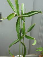 鉢の底から根が出て根詰まり気味になったら植え替えをします。植え替えは2年に1度を目安に行います。時期は5月から6月が理想的です。用土は売られているサボテン、多肉植物用の土を利用したり、自分で作る場合は赤玉土(小)6、腐葉土2、パーライト2ぐらいに植えればよいと思います。ドラゴンフルーツの種類によってはトゲがとても鋭いものがあります。手に刺さらないような手袋をつけて作業する事をお勧めします。その他、詳しくは観葉植物の植え替えのページをご覧ください。増やし方(挿し木)