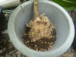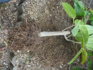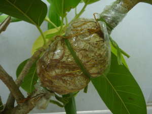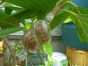 2ヵ月もすると発根してミズゴケから根が見えるようになるので切り取ります。普通の用土を使って鉢植えに植えつけますが、ミズゴケを無理してはがそうとすると根が切れやすいので、濡らして簡単にほぐす程度でよいです。葉が伸びてくるまでは明るい所に置き、少しずつ直射日光に慣らせます。![]() 取り木での発根 |