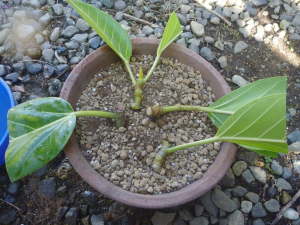 時期は5月から8月頃まで行えます。挿し穂は2,3節分、長すぎる場合は1節分でもよいです。切り口から白い樹液が出るので水の入った容器などに出なくなるまで漬けておきます。葉の面積が大きく水分の蒸散が多いので、ハサミで葉を半分ぐらいに切ると挿し穂の痛みが緩やかになります。葉の表が上になるよう切り口が土に埋まらない程度に土に埋めます。明るい日陰に置いておくと2か月もすると発根するので鉢に植えつけます。その他は挿し木のページを参考にしてください。![]() 水に漬けて樹液を出す |
