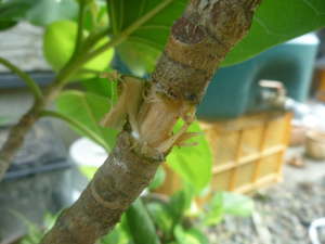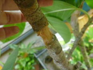 茎の途中に切れ込みを入れてミズゴケを巻くと根が出るので、その部分を切ってすぐに大きな苗を作る事ができます。また大きく育ちすぎてしまった場合は取り木から仕立て直すという方法もあります。@皮の取り除き