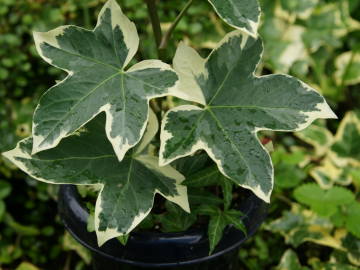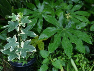 ヘデラ(ヘリックス)を交配して作られた園芸品種です。通常は同じ属同士で交配されるのですが、この植物は別の属同士が交配された種類です。ヤツデもヘデラも比較的丈夫なウコギ科の植物なので、ファトスヘデラもその血を引き継いだ丈夫で育てやすい観葉植物です。手を広げた10cm〜15cmぐらいの葉をしており、ヤツデより小さくヘデラよりも大きな葉をしています。茎は蔓性ではなく半つる性で、ヤツデのように上に向かって直立して育ちます。葉は緑色をした種類から斑入りの種類もあります。