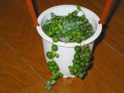 葉の間の茎を埋めると3週間ぐらいで根が出てきます。玉を何個かつけた適当な長さの挿し穂を何本か用意して、茎が用土に埋まるように這わせます。用土は川砂の単用やパーライト6、ピートモス4など、水はけのよい用土に挿します。過湿にならないよう水やりに注意しますが、多肉植物としてはやや水を必要とするので、発根するまでは乾かし過ぎないように注意します。時期は4月から5月ぐらに行うのが理想的ですが、暖地では涼しくなった秋にも行えます。| グリーンネックレスの挿し木 |