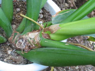 伸びた茎から気根が伸びるので、その部分を残して切り挿し穂にできます。定植用の鉢植えと土を使い、気根が埋まるように植えればよいです。時期は5月から8月頃まで行う事ができます。何年も育て続けると植物が大きくなり、鉢が大きくなり過ぎたように感じたら、挿し木から作り直してもよいです。また気根の部分に湿らせたミズゴケを巻いて、ビニールで完全に覆って根が出たら、その部分を切って鉢に植える取り木もできます。![]() 伸びた気根 |