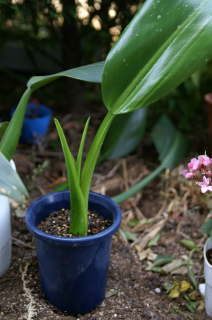 葉が横に広がって邪魔に感じる事があります。植え替える際は深めに植えて、葉が伸びても鉢の縁に当たって上向きになるよう工夫して植えてもよいです。![]() 横に広がって邪魔な葉 |