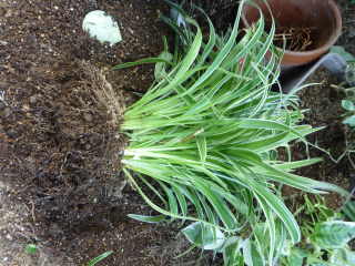 株分けで増やすことができます。根はオリヅルランと同じく白い多肉質の根をしており、手で裂くようにすれば容易に分ける事が出来ます。時期は植え替えと一緒に行います。![]() 株分け前 |