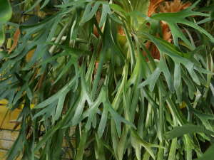一つの株に2種類の葉があるとてもユニークな姿をしています。一方は長い葉が下に垂れてよく目立つ胞子葉と呼ばれるもので、鹿の角のような形をした先端は葉裏にシダと同じように胞子が出来るようになっています。もう一つは外套葉(がいとうよう)、水が蓄えられるので貯水葉とも呼ばれるもので、はじめは青い葉をしていますが、古くなると茶色く枯れてもそのまま落ちずに残ります。これは乾季のある自生地で乾燥に耐えるよう水分や養分が蓄えられるようになっています。![]() 胞子葉 |