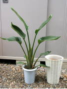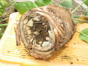 根が伸びるのが早いので、植え替えは毎年、もしくは2年に一度は植え替えをします。時期は5月から6月頃が理想的です。根は多肉質で太く乾燥に強い根をしており、植え替えずに放置しておくと、根が強く圧力で鉢を割ってしまうほどです。用土は市販されている観葉植物専用の土を使用すればよいと思います。自分は赤玉土(小粒)6、腐葉土4で植え替えています。根が下によく伸びるので、鉢は長めの鉢を使います。葉が切れやすいので、作業時は葉をできるだけ切らさないように注意してください。下の写真は1年で根詰まりしたので、長鉢に植え替えた時の写真です。株元が寂しいのでヘデラを植えてみました。その他、詳しくは観葉植物の植え替えのページをご覧ください。| オーガスタの植え替え(2006/4月下旬) |