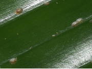 右は葉に発生した時のものです。排泄物で葉がベタベタしてきます。古い歯ブラシなどで落として、ベタベタした排泄物がついたものは霧吹きなどで水をかけ、ティッシュなどでふき取ってスミチオン乳剤などを散布しておきます。その他、害虫については観葉植物の主な害虫のページを参考にしてください。![]() カイガラムシ |