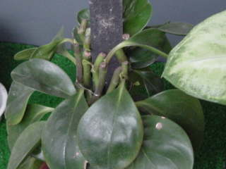 オブツシフォリア(Peperomia obtusifolia)が代表的な品種です。斑入りをしたキフペペロミア('variegata')もよく出回っていて生育はやや遅いです。 ヘゴ仕立てにされて売られている事がよくあります。![]() ペペロミア・オブツシフォリア |