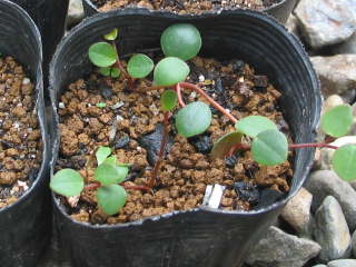 オブツシフォリアやキフペペロミアなどの木立性はヘゴ仕立てに向いています。材料の苗は複数本を挿し木や水挿しで増やしたり、売られている苗を利用してもよいです。植え方は園芸店に売られているヘゴを鉢の中央に立て、苗を周りに植えるだけと簡単です。ペペロミアは木根を出さずヘゴに着いて登らないので、茎を針金やビニタイで括り上へ誘引させます。![]() 素材のキフペペロミア |