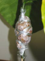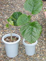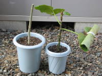 茎挿しで増やすことが出来ます。3節分ぐらの挿し穂を用意して、一番下の節の葉を取り除き、そこが土に埋るように挿します。葉が大きいので丸めて紐で括ったり、葉の面積が3分の1ぐらいになるように切って葉の蒸散を抑えるようにします。その後は土を乾かさないよう、風の当たらない明るい日陰で管理します。時期は5月から7月頃に行い、芽が伸びてきたら植え付けます。その他、詳しくは挿し木のページを参考にしてください。![]() 葉を丸めて括る |