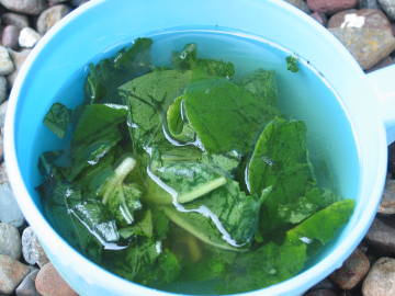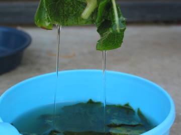 マダガスカルの現地の人はウンカリーナの葉でシャンプーやハンドソープとして利用しているそうです。特に害はないようでワオキツネザルも葉を食べていようです。作る方法は葉をしばらく水に漬けて、葉を揉むようにすると粘液が出てきて水がトロトロになります。シャンプーのように泡は出ませんが、ヌルヌルした感じでリンス代わりにもなりそうです。出来た液はとても潤う感じなので、手の保湿効果もありそうです。![]() 葉を揉んだ |
