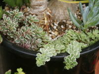 同じ多肉植物同士の寄せ植えにしてもよいと思います。購入した苗を使ってもよいですし、挿し木で容易につくので、他の種類と一緒に挿して寄せ植えにしてもよいと思います。![]() 株元に寄せ植え |