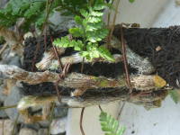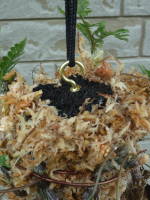 いろいろな作り方がありますが、ここでは簡単な方法を紹介しています。材料はヘゴ支柱、ミズゴケ、細いエナメル線、ぶら下げるために必要なヒモと吊り金具です。はじめにヘゴ支柱や木材を好きな長さに切ります。紐で吊るための吊り金具、反対側にも風鈴を下げるための吊り金具をつけておくとよいです。周りに湿らせて絞ったミズゴケを巻いて、細いエナメル線などでぐるぐる巻きにします。根茎をミズゴケに這わせるようにして、エナメル線で巻きつけて固定します。吊り金具を付けて紐で吊るせるようにします。根茎を巻いたエナメル線は着いたら外すとよいです。![]() 材料 |