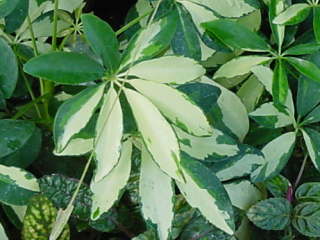 原種は葉の先端が尖り枝が多く分岐します。よくお店に出回っているのは園芸品種のシェフレラホンコンで、原種に比べると葉が厚くて先端は丸く、全体的にまとまった姿をしています。また斑入りの品種も葉の先が丸いタイプと尖ったタイプがあり、生育が穏やかな感じがします。その他にも園芸品種で小枝の多いコンパクタ、ホンコンの実生で出来た葉先の形が不規則なレナータなどもあります。いずれも育てやすさにあまり違いはないです。![]() シェフレラホンコン |