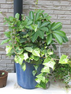暖房のある部屋は、暖房を切った時間との寒暖の差が大きく、少し暖かくなる初春になると葉が一気に落ちる事があります。シェフレラは暖地の戸外で越冬するほど比較的寒さには強いので、気温が5度以下にならない暖房の効いていない部屋に置いた方が葉が落ち難いです。葉が落ちるだけで枯れる事はないですが、葉が茂るまで寂しい姿になってしまいます。![]() 葉が落ちる前 |