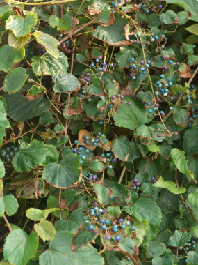テリハノブドウは暖地の主に海岸に分布する落葉樹で、ノブドウが変異したもで葉に光沢している事からこのような名前になったようです。夏に小さな花を咲かせ、秋に紫色から青色をした0.7cmぐらいと小さな実を成らせます。ノブドウは日本全土に分布していますが、こちらは暖地の海岸の日当たりの良い所に自生しています。実の中には「ブドウタマバエ」や「ブドウガリバチ」の幼虫が寄生している実が多く、実の色が様々な色合いをしているのは虫が寄生しているからと言われる事があります。実が熟すと中が液体になるのですが、不味くて食べられないそうです。テリハノブドウは丸っこい葉をしていますが、ノブドウは葉に切れ込みがあるものと、丸い葉をしたものが交じる事があり、葉に深い切れ込みの多いものをキレハノブドウと分けられることがあります。また、斑入りで葉に切れ込みのあるフイリノブドウというのもあり、観賞用に販売されています。