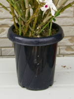 洋蘭を植えつける鉢ですが、水苔に植え付ける場合は洋蘭用の素焼き鉢に植えるのが一般的です。鉢は底が多湿になりやすいので、鉢の底に沢山軽石を入れたり、空洞を作る事で根腐れ防止される事があります。バークなどに植える場合は素焼きでもプラスチックや化粧鉢でもかまいませんが、素焼き鉢は通気性がよいので、用土の渇きがとても早くなります。水を好む洋蘭はプラスチック鉢や化粧鉢に植え付けた方がよいと思います。洋蘭は大きい鉢を嫌う種類が多いので、小さめの鉢を使用するようにします。