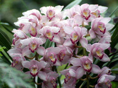 シンビジュームの育て方冬から春に購入した開花株の管理室内のなるべく日光の当たる明るい窓辺などに置きます。比較的寒さには強いのですが、冬に貰ったり購入したものは温室育ちなので、極端に冷え込むような寒い所は避けます。夜間の温度は10度〜15度ぐらい、昼間の温度が23度以下を保てるような所に置くのが理想的です。冬の夜間10度〜15度を保てない部屋では、寒さに急に当てるのは避けて、徐々に最低温度5度〜10度ぐらいの所に慣らせていきます。逆に高い温度は花もちが悪くなるので、昼間25度以上、夜間20度以上と温度の高い場所には置かないようにします。水やりは植え込み材料が乾いたら与えます。開花中の水切れは注意しますが、真冬の水の与え過ぎにも注意してください。肥料は開花中は与えません。置き場ソメイヨシノが咲く頃までは、室内のできるだけ直射日光の当たる場所に置きます。ソメイヨシノが散ったら、戸外の日光のよく当たる風通しのよい所に置きます。5月から10月までは遮光ネットで30%〜50%ぐらい遮光して育てます。薄霜が降りるようになれば室内のできるだけ日当たりのよい場所に置きます。つぼみや花が咲いている時期に2度以下の低温、25度以上の高温にさらされると花やつぼみに害がでるので注意します。冬の室内での理想的な気温は夜間5度〜10度ぐらい、昼間は23度以下の所が理想的です。開花時期の違い12月になって花芽が出たら、その後は、最低温度が10度ぐらいで1月から2月頃の開花、最低温度が7度ぐらいで3月頃の開花、最低温度が4度ぐらいだと4月から5月頃の開花になります。水やり生育期の春から秋は植え込み材料の表面が乾けば与えます。夏はよく乾くので毎日の水やりになります。冬はやや控えめに、乾いた翌日に与えるぐらいにします。蕾が見えてから開花したものは水切れさせないよう、表面が乾いたら与えます。冬の水の与えすぎは根腐れする事があるので注意してください。肥料比較的、肥料を好みます。4月〜7月頃まで骨粉入りの固形油粕などを置き肥をして、5月頃の新芽が出る時期から10月頃まで週に1回ぐらい液体肥料を与えます。植え替え