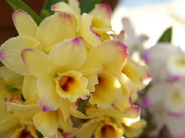 デンドロビュームの育て方 (ノビル系)冬から春に購入した開花株の管理最低気温7度以上に保てる暖かい場所に置きます。寒さに強いデンドロビュームとはいえ通常買ってきたのは温室育ちです。強い寒波などで朝冷え込みそうな時にはダンボールに入れ新聞紙でくるむなどして保温してだんだん寒さに慣らせていきます。水やりは植え込み材料の表面が乾いてから与えます。花が咲いていますので、水切れには注意します。しかし、与え過ぎは根腐れの原因になるので注意してください。暖房の効いた部屋は乾燥しますので、霧吹きなどで湿度を与えてあげます。肥料は開花中とはいえ株は成長を休止していますので、一切与えません。デンドロビュームの花は1ヶ月ぐらい咲いて長持ちです。通常の洋ランのように花が咲いたら茎を切り取る必要はありません。花が終わるとしおれてきますので、花の付けねから切り取ります。花の終わった茎からはあまり花を咲かせる事はあまりありませんが、春の新芽が出る時期の水分や養分になりますので、茎は切り取ってはいけません。2年ぐらいしてしおれてきたら切り取ります。春から夏までの管理最低気温が15度以上になれば室外の直射日光が半日以上当たる、風通しのよい場所へ置きます。デンドロビュームは日光をとても好みますが、夏は葉焼けするので20%〜30%ぐらい遮光します。水やりは植え込み材料の表面が乾いたらたっぷりと与えます。真夏はよく鉢が乾きますので水切れには注意します。肥料は春の最低気温が15度以上になってから8月上旬までに液体肥料などを与えます。8月上旬以降からは肥料は完全に打ちきります。もし固形肥料などの置き肥を与えている場合は7月上旬前には完全に打ちきります。もし肥料の打ち切りを行わないと花芽ができず、高芽ばかりがついてしまいます。もし今シーズン花の開花が期待できない若い苗を育てる場合は、秋まで肥料を与え続けて大きく育ててください。秋から冬までの管理秋になると気温がだんだん下がってくるので、水やりもだんだん減らしていいきます。大体植え込み材料が乾いてから翌々日に与えるぐらいにまで減らします。もし水やりを減らさずに普通に与えてしまうと、茎は太っていくのですが、花芽のできにくい株になってしまいます。また秋の長雨にも当てないように注意してください。秋も深まると最低気温が下がって部屋へ入れてあげたくなるところですが、デンドロビュームは自然でも最低気温が5度程度になり、ある程度の寒さに当てやらないと花芽ができません。最低気温が8度前後の寒さが2週間ぐらい続いてから室内へ取り込みます。室内へ取り込んでからの開花は、最低温度によって開花の時期が変わってきます。最低温度が15度ぐらいの時は1月〜2月ぐらいの開花、最低温度が10度ぐらいの時は3月ぐらいの開花、最低温度が3〜4度と低ければ4月〜5月ぐらいの開花になります。通常家庭では3月〜4月頃の開花になります。室内の暖かい天気のよい日や暖房で暖かい時はできるだけ霧吹きで加湿するようにします。そうする事で花芽を分化させつぼみを膨らませます。冬の水やりは植え込み材料が乾いた翌日ぐらいに与えます。水の与え過ぎは根腐れの原因になるので注意します。花が開花すれば乾きが早くなりますので、乾かし過ぎないように注意します。花の咲かせるポイント