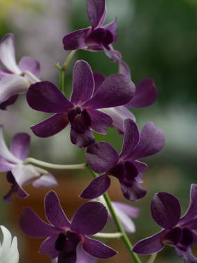 花茎切り花は下から上に向かって咲きます。他の洋蘭と同じく花はいつまでもつけておかずに、先端の花が開いて、はじめに咲いた花がしおれたら花茎の付け根から切り取ります。切り取った花は切り花に利用できます。花茎は胡蝶蘭のように途中から切っても、2番花が咲くような事はありません。ノビル系のように高芽がつく事があるので、秋頃に切りとって植え付けて増やす事ができます。高芽はいつまでも切り取らずにほっておくと株に悪影響がありますので、必ず切り取ってください。 |