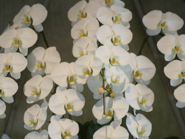 胡蝶蘭の育て方寒い時期に購入した胡蝶蘭の開花株熱帯の植物で、寒さがとても苦手です。真冬に購入したものは温室育ちで、開花株は最低温度を15度ぐらいに保つ必要があります。置き場所はレースカーテン越しの日当たりのよい場所に置き、水やりは植え込み材料の表面が乾いて水気が感じられなくなってから、室温ぐらいに暖めた水を与えます。水の与えすぎは根腐れの原因になりますので注意します。ただし湿度を好むので、ある程度空中湿度が必要です。暖房の効いた部屋などでは暖かい時間に何回か霧吹きなどで加湿してあげます。空中湿度が不足すると花の寿命も短くなります。肥料は開花中に必要ありません。開花も終盤になって一番最後の花が咲き終わったら、切り花にすると結構長く花を楽しむ事ができます。切る際に花茎の途中で花茎切りを行うと2番花が咲く事があります。売られている花後の胡蝶蘭数株のポット苗や裸苗が寄せて植えられてる事が多いです。そのまま管理すると根が腐りやすく育てるのが難しいので、花が終わったら各一株ずつにして育てるようにします。花が終わった時期が丁度5月から6月頃なら、一鉢ずつにして植え替えますが、それ以外の時期なら、数株のポット苗や裸苗を出して、ポット苗は一つずつにして育て、裸苗の場合は同じぐらいの大きさの素焼き鉢にそのまま入れて育て、春の5月から6月頃になったら植え替えます。前書き年間を通じで販売されていますが、これは温室で温度調節され強制的に花を咲かせたものです。自然では11月から12月に花茎が伸び、冬に加温した温室では2月から3月頃の開花、暖房の効いた暖かい部屋に置いた簡易ビニール温室内では3月から4月頃の開花、暖かい通常の室内ではそれ以降の開花になります。ただし、胡蝶蘭は冬の寒さ、冬の乾燥(空気)にも弱く、室内に置いただけで花を咲かせるのは難しくなります。置き場