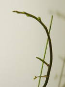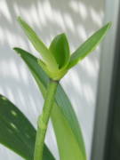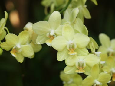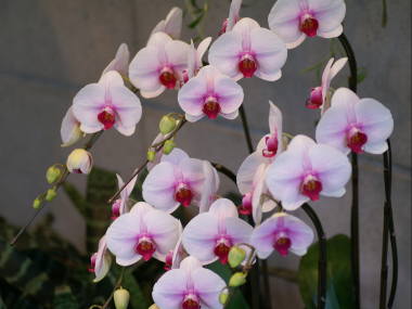 肥料最低気温が15度以上の生育温度があり、花の開花していない時期なら定期的に洋ラン用の緩効性化成肥料を置き肥したり、一週間に1回洋ラン用の液体肥料を与えます。普通の液体肥料の場合は通常の5倍ぐらい薄めにして与えます。開花している時期や冬の生育温度のない場所での肥料は必要ありません。支柱と誘引ミニ胡蝶蘭は花が小さく、花茎が短いと花の重みであまり垂れ下がる事はないので、簡単に支柱で支えるぐらいでかまいません。もし姿をよく見せたいのであれば、必要に応じて誘引するとよいと思います。大きな花が咲くタイプは花の重みで花茎が垂れやすく、姿をよく見せるためにも支柱とビニタイなどを使って誘引するとよいです。明るい方向に花茎が曲がって伸びるので、曲げたい方向が明るくなるよう鉢を置きます。曲げた支柱に花茎を誘引する方法は、若くて柔らかい花茎を支柱に沿って無理せず曲げ、折れやすい節を避けた所を簡単にビニタイで仮止めします。しばらくして更に花茎が伸びたら前回仮止めした所を必要なら本止めして、更に伸びた花茎をまた無理せず曲げて仮止めします。これを花茎が伸び終わるまで繰り返します。もし、支柱が足りなくなったら、適度な長さに切った支柱をビニールテープなどでつなげて足せばよいです。慣れれば難しい事はありませんが、せっかく伸びた花茎なので、無理に曲げて花茎を折らないよう注意してください。特に硬くなった花茎は折れやすいです。花は明るい方に向いて咲くので、その後も花茎の先端を明るい方に向けたまま花を咲かせます。
