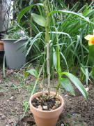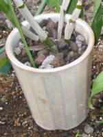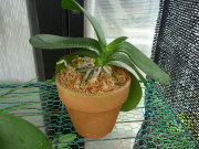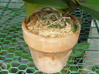 洋蘭を植えつける鉢ですが、水苔に植え付ける場合は洋蘭用の素焼き鉢に植えるのが一般的です。鉢は底が多湿になりやすいので、鉢の底に沢山軽石を入れたり、空洞を作る事で根腐れ防止される事があります。バークなどに植える場合は素焼きでもプラスチックや化粧鉢でもかまいませんが、素焼き鉢は通気性がよいので、用土の渇きがとても早くなります。水を好む洋蘭はプラスチック鉢や化粧鉢に植え付けた方がよいと思います。洋蘭は大きい鉢を嫌う種類が多いので、小さめの鉢を使用するようにします。